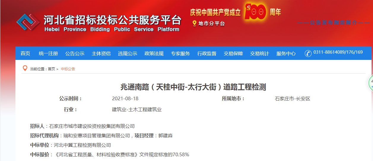 中冀检测中标兆通南路(天桂中街-太行大街) 道路工程检测项目